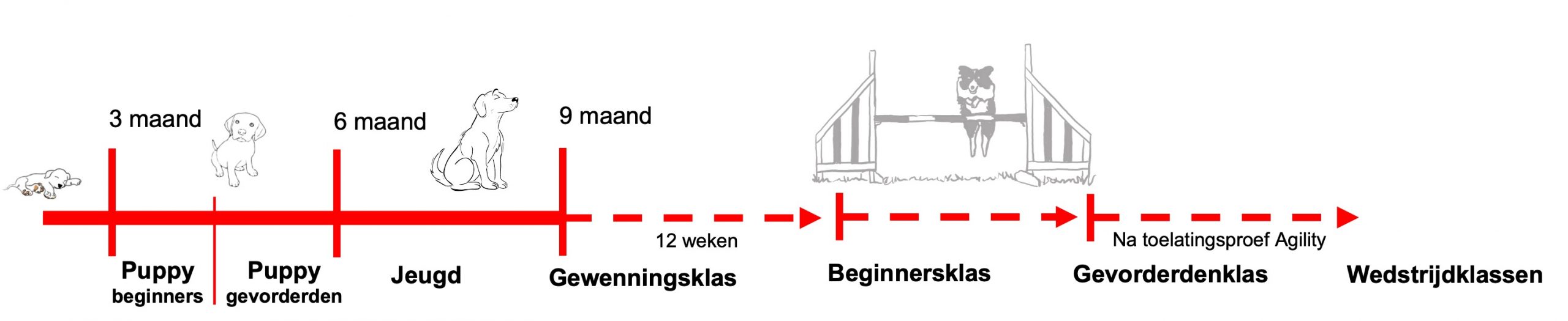Wanneer men erin slaagt om deze officiële Toelatingsproef Agility tot een goed einde te brengen, is de basisopleiding ten einde en komt men in de wedstrijdklas.